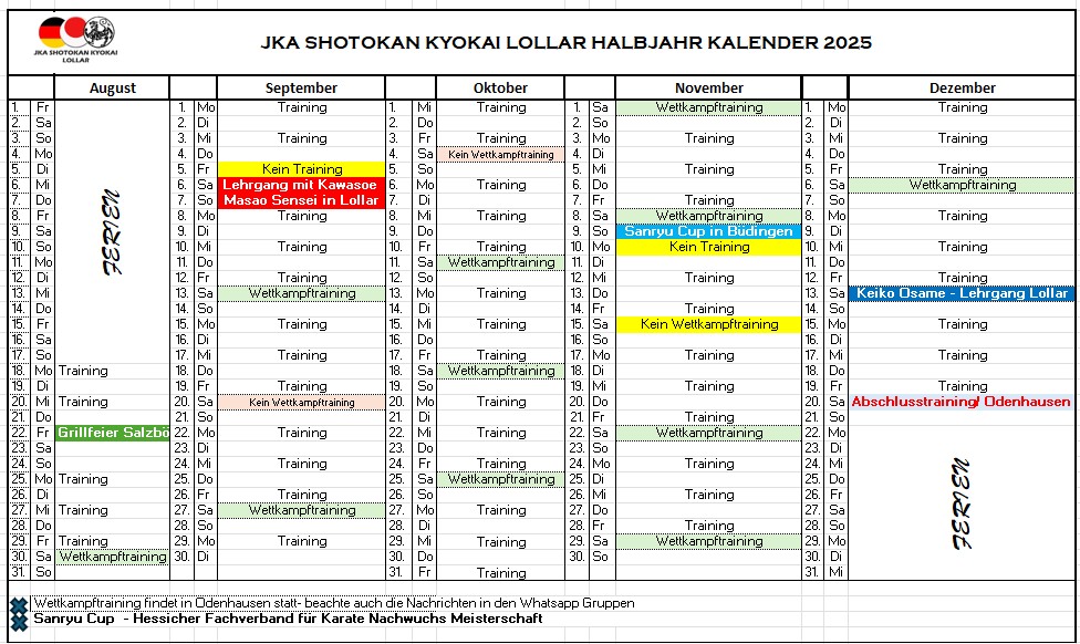 2.Halbjahr Kalender 2025 für Training/ Leistungstraining/Veranstaltungen