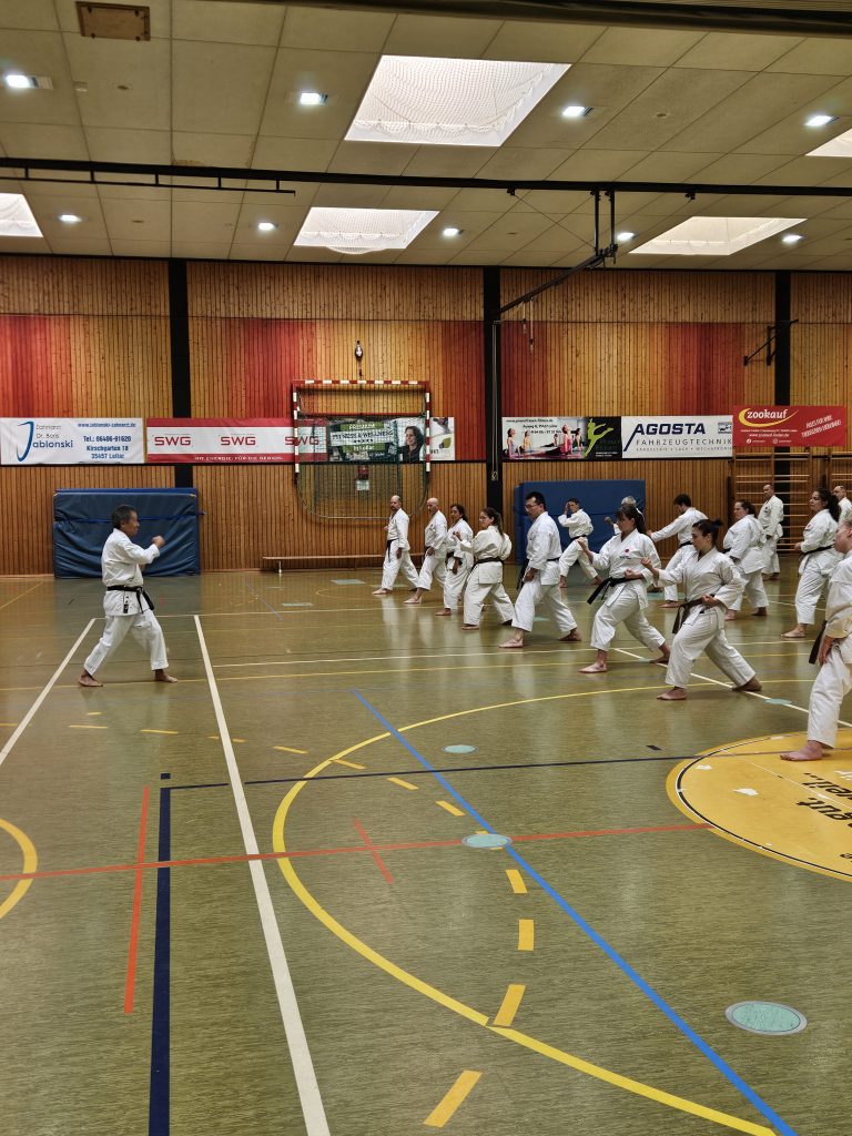 Die Karateka durften wieder einmal einen einzigartigen Trainer erleben. Mit seinen 69 Jahren zeigt Kawasoe Masao eine unglaubliche Flexibilität und Genauigkeit in seinen Bewegungen. Hier zählen oft ein scharfes Auge und ein großes Verständnis für Karate, um zu verstehen, was der Meister zeigt. Das Training schulte nicht nur Körper, sondern auch den Geist. Das Wochenende erreichte am Samstag Abend seinen Höhepunkt.