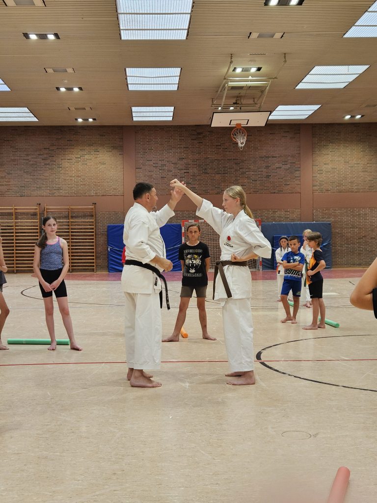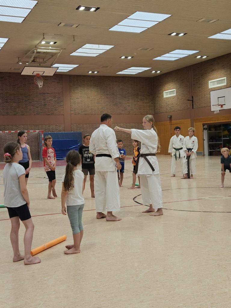 Zum Abschluss demonstrierten erfahrene Karateka aus dem Dojo (von Weiß- bis Braun-Gurt) inspirierende Kata- und Kumite‑Sequenzen, um den Kindern zu zeigen, was sie mit kontinuierlichem Training erreichen könnten. Und als kleines Highlight gab es zum süßen Abschluss für jede und jeden eine Kugel Eis – ein gelungener, belohnender Moment nach viel Einsatz und Begeisterung